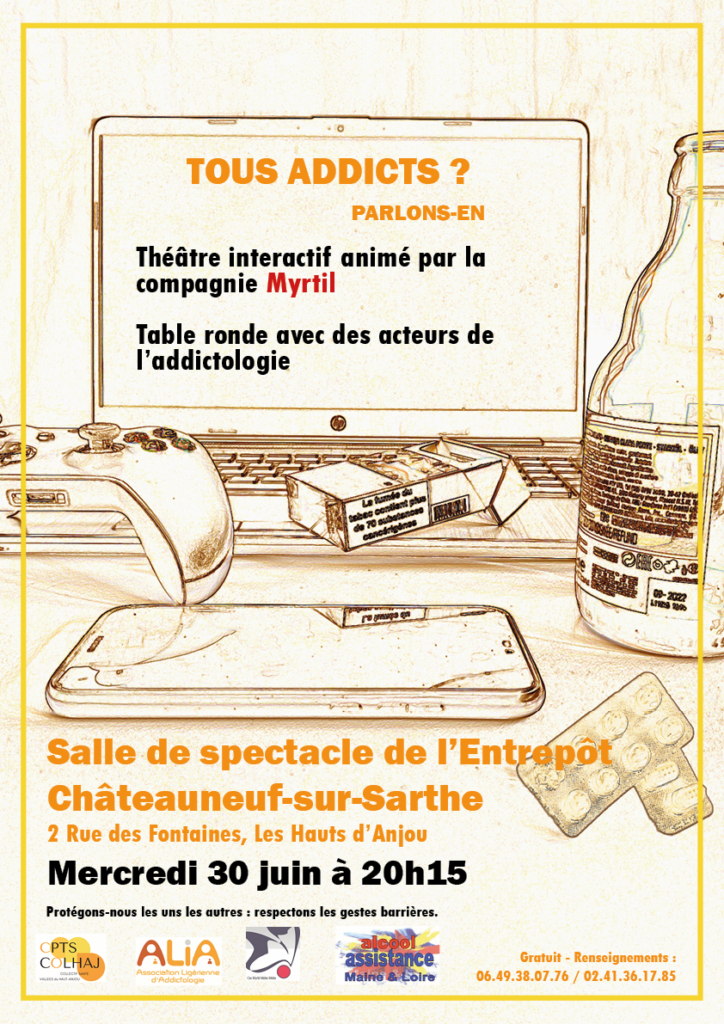 Le mercredi 30 juin 2021 : La CPTS organise une soirée de prévention des additions « Tous addicts ? Parlons-en », à Châteauneuf-sur-Sarthe, aux Hauts-d’Anjou. La compagnie Myrtil prépare un théâtre interactif autour du thème des addictions, puis des acteurs de l’addiction sont invités à discuter : Le Dr. Renier-Tisné, médecin généraliste à Châteauneuf-sur-Sarthe ; le Dr. Marine Pareaud, médecin psychiatre à Angers ainsi que M. Charrier, représentant de l’association Entraid’Addict 49.